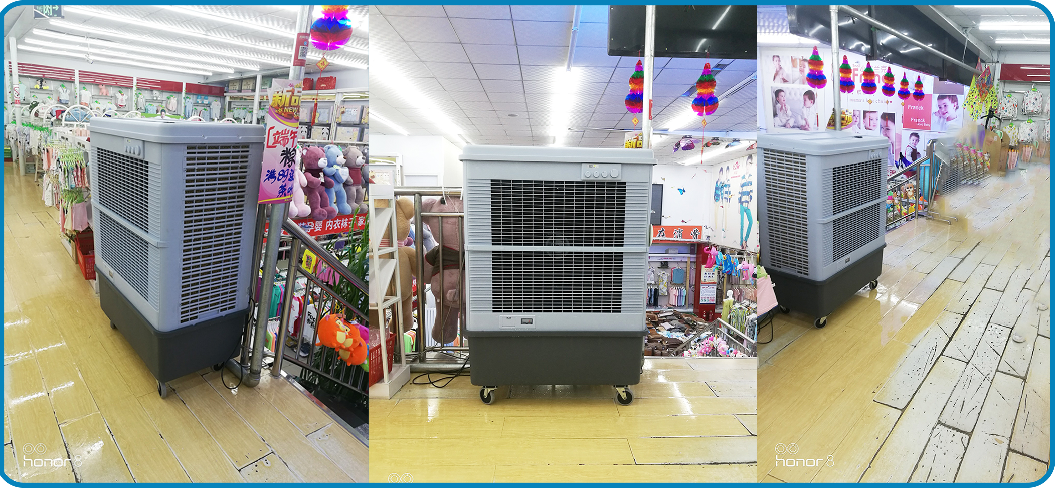 超市原有的煩惱:“我們超市位于繁華商圈,夏季每天進出顧客超萬人次,為了讓顧客進出順暢、保持室內空氣新鮮,大門必須全天敞開。但這也帶來了大問題,傳統(tǒng)空調根本頂不住,冷氣全往外跑,室內溫度居高不下,不少顧客逛幾分鐘就因為悶熱離開,營業(yè)額受到很大影響。”該超市運營負責人張先生坦言,此前也曾嘗試過多種降溫方式,但要么需要封閉環(huán)境才能起效,要么降溫效果微弱,始終無法滿足“敞開大門+降溫5-15度+空氣流通”的核心需求,這一難題讓運營團隊十分困擾。